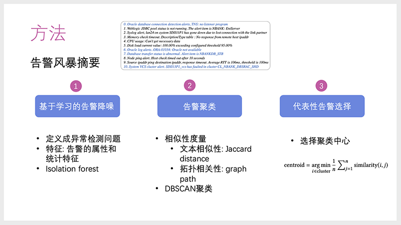 第二部分,告警风暴摘要。准确检测到告警风暴发生后,需要做三个步骤:基于学习的告警降噪,将告警风暴中与此次故障无关的告警全部删除;差异化的告警聚类,总结告警里有多少告警簇;代表性告警选择,在每一个簇找到代表性的告警选择,减少工程师看的数量。最终的目的是通过告警风暴摘要,选取出与故障相关的告警集合,并且这些告警能够从多方面反映故障。