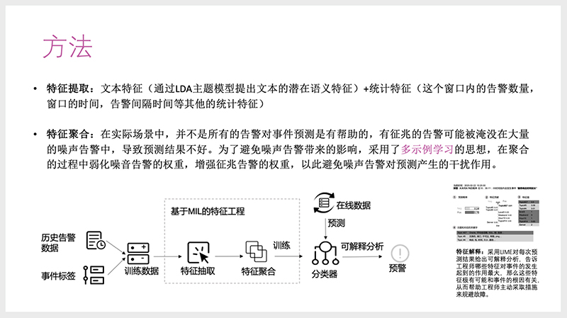 下图是整体的方法,通过历史告警数据和事件的标签得到训练数据,再进行特征抽取和特征聚合,完成后利用分类器建立模型对在线数据进行预测。最后加上可解释分析。因为我告诉你未来要发生故障,但是不告诉原因,大家就很难操作。对于该做什么、怎么相信,我们给出了可解释分析的结果。