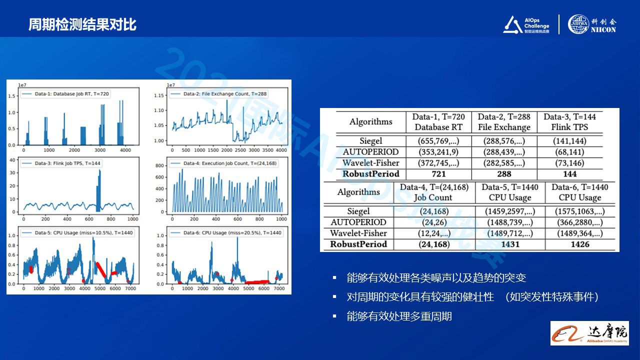 接下来,看一下这个方法的性能。从几个维度去看,一个是说能不能对噪音进行鲁棒,它的周期偏移趋势的变化,以及它的这种对这种多周期的处理问题。我们看到很多这种对比算法,它都会有一些或者在其中的一些小点上有一些不足,但如果我们的方法能够这些性能都能够很好的支持。