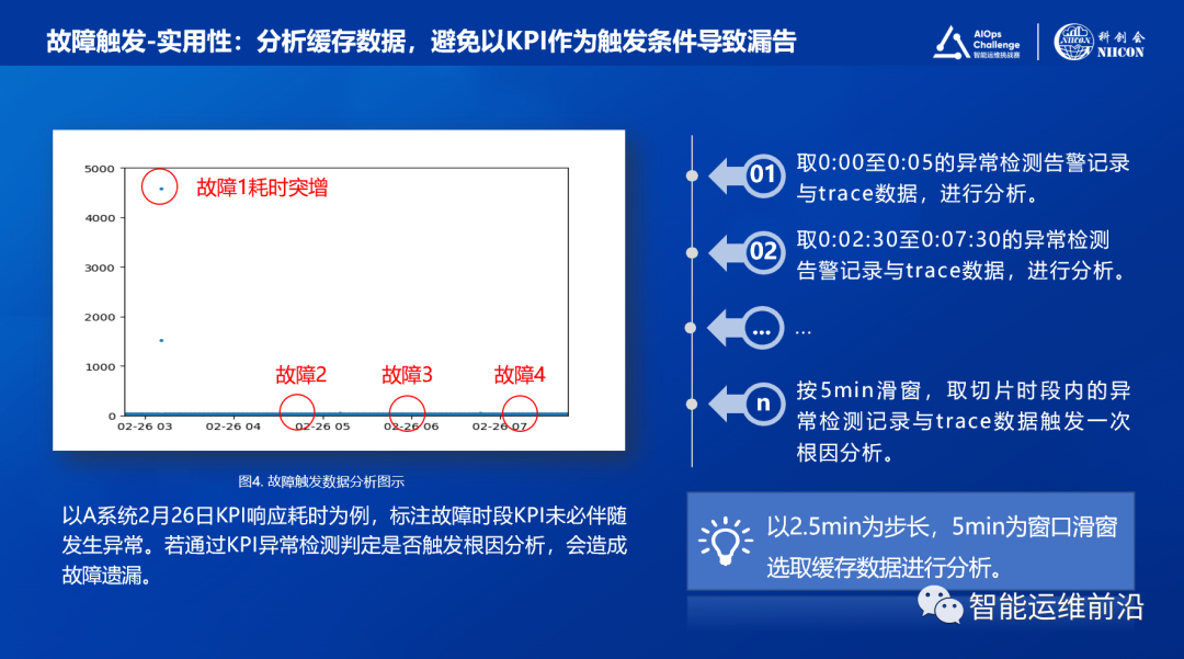 因此,对于故障的触发,方案将直接分析缓存的各维度数据判定故障与根因,而不会以KPI作为唯一触发机制。具体方法是,对缓存数据进行滑窗切片(以2.5min为步长,5min为窗口滑窗),对每个切片进行一次故障判定与根因分析,保证了在竞赛场景下较高的故障发现能力。
