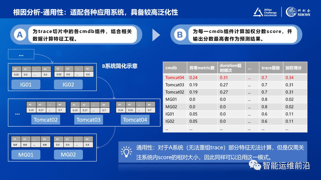 关于通用性,对于A系统无法重组trace,部分特征无法计算。但是, 此方案仅需关注cmdb组件间的相对score比较,因此仍然可以沿用这套方案进行加权评分并找到最大值。因此,这套方案具备较高的通用性,可以通用适配不同数据可用性下的场景。
